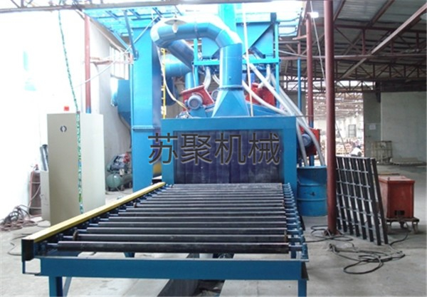 輥道式拋丸機(jī)是利用高效拋丸器拋出的高速彈丸流束擊打抽油桿表面上氧化皮、銹層及其雜物,使之獲得精細(xì)的光亮表面,使工件顯出金屬本色,有助于提高釬桿涂飾質(zhì)量,達(dá)到防腐、護(hù)管、延長工件使用壽命之目的。